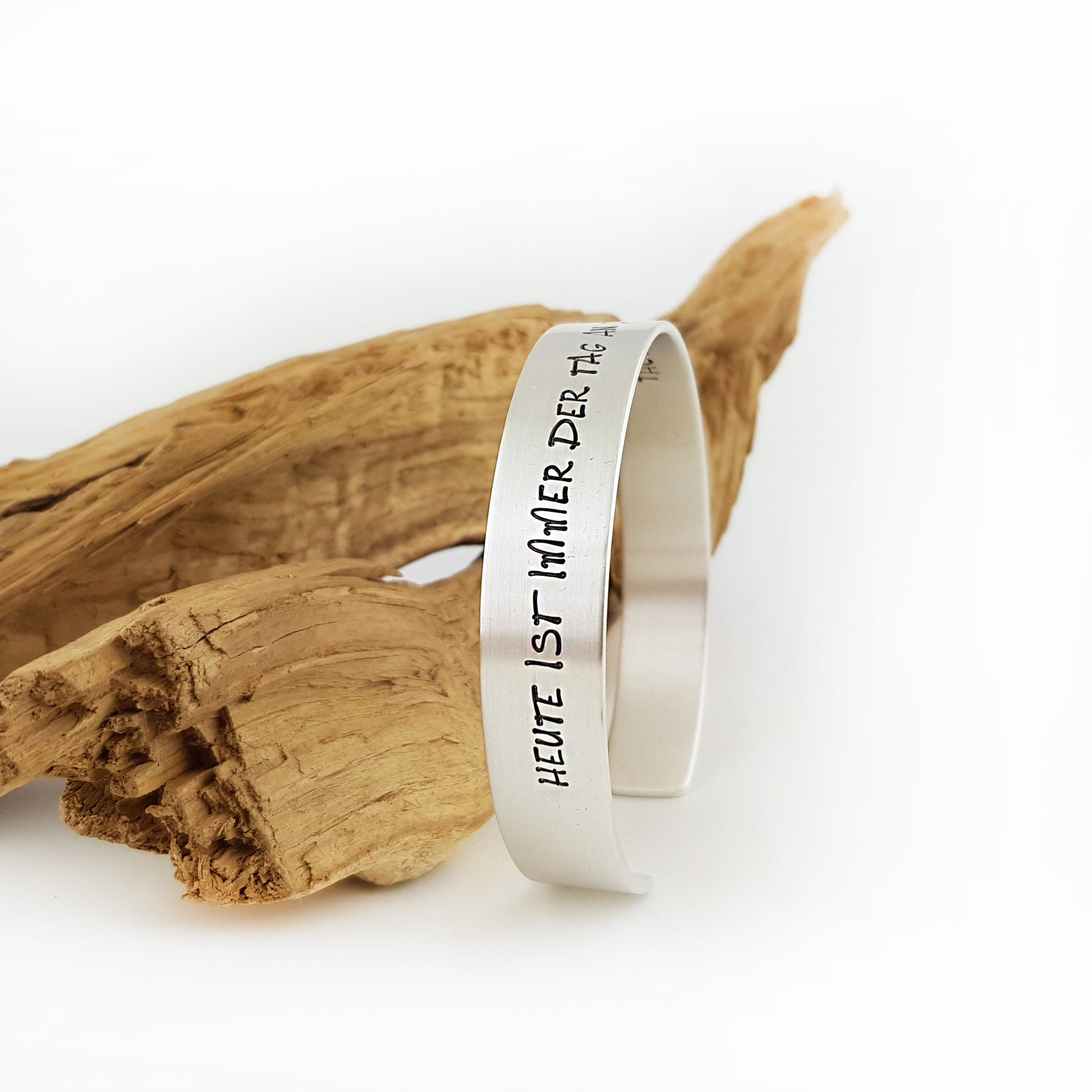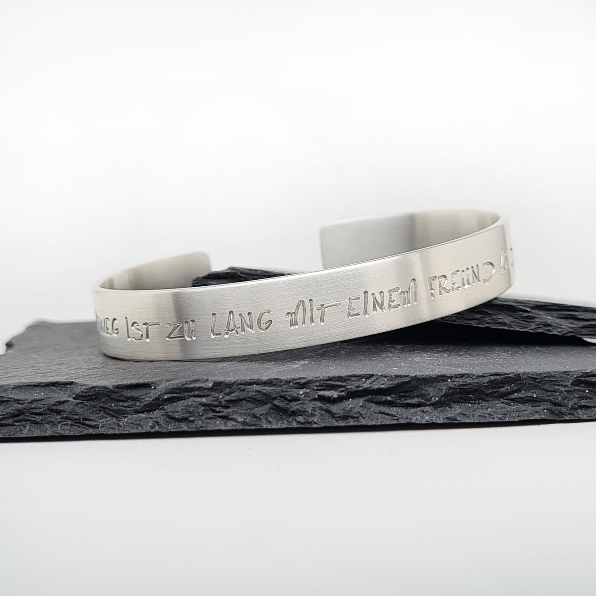 Gestalte Deinen eigenen Text oder wähle ein bekanntes Zitat. Kombiniere Namen, Daten, Koordinaten oder einzelne Worte. Die Anzahl der Buchstaben ist von der Größe des Armreifs und der Schreibweise abhängig (Groß- und Kleinscheibung oder Großbuchstaben).